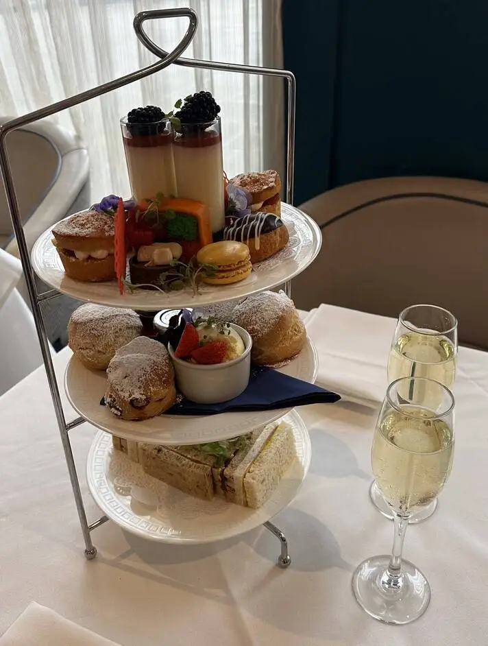 Enjoy a carefully crafted selection of delicate finger sandwiches, freshly baked scones with clotted cream and jam, and an array of sweet treats, all served with your choice of tea.